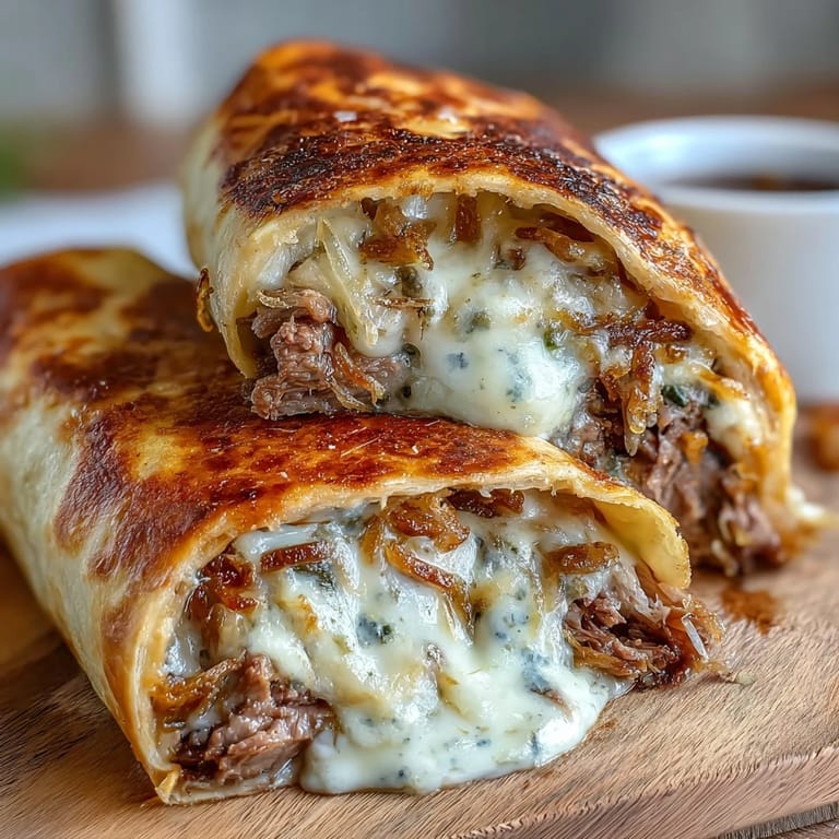 Save All the savory comfort of a classic French dip, wrapped in a crispy tortilla for an easy, hand-held appetizer or main dish. Tender roast beef, melted provolone, and crunchy fried onions are baked to golden perfection, then served with warm au jus for dipping. This recipe offers a quick, 25-minute solution for busy weeknights or game day gatherings.