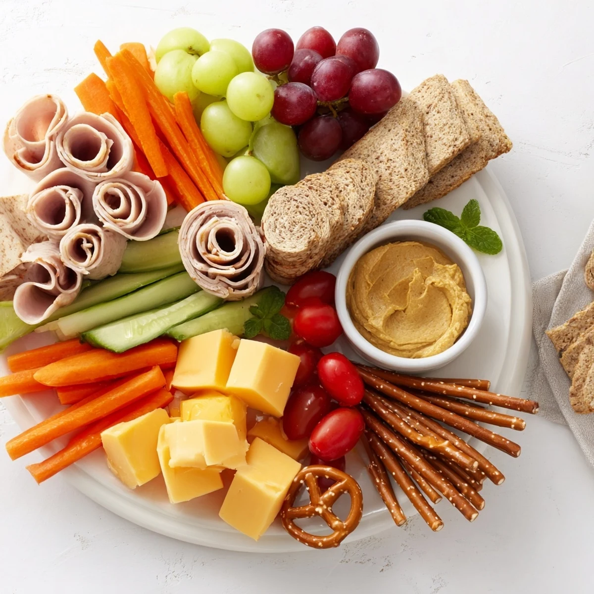- Dips & Condiments: 1/2 cup hummus 1/4 cup honey 1/4 cup grainy mustard