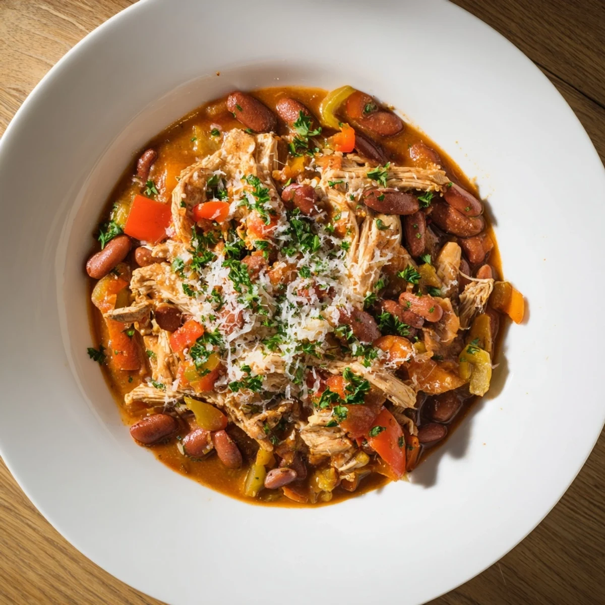 This recipe is forgiving by design, which is why it works so well as a base for improvisation. If you find navy beans too mild, swap in cannellini or Great Northern beans for a slightly different texture. Vegetarians can drop the chicken entirely and use vegetable broth instead, and the stew loses nothing—it just becomes lighter and lets the peppers and beans take center stage.