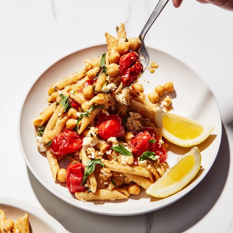 Save A vibrant Mediterranean-inspired dish featuring creamy baked feta, hearty chickpeas, and sweet roasted tomatoes. Serve over pasta or rice for an affordable, satisfying meal that bursts with flavor in every bite.