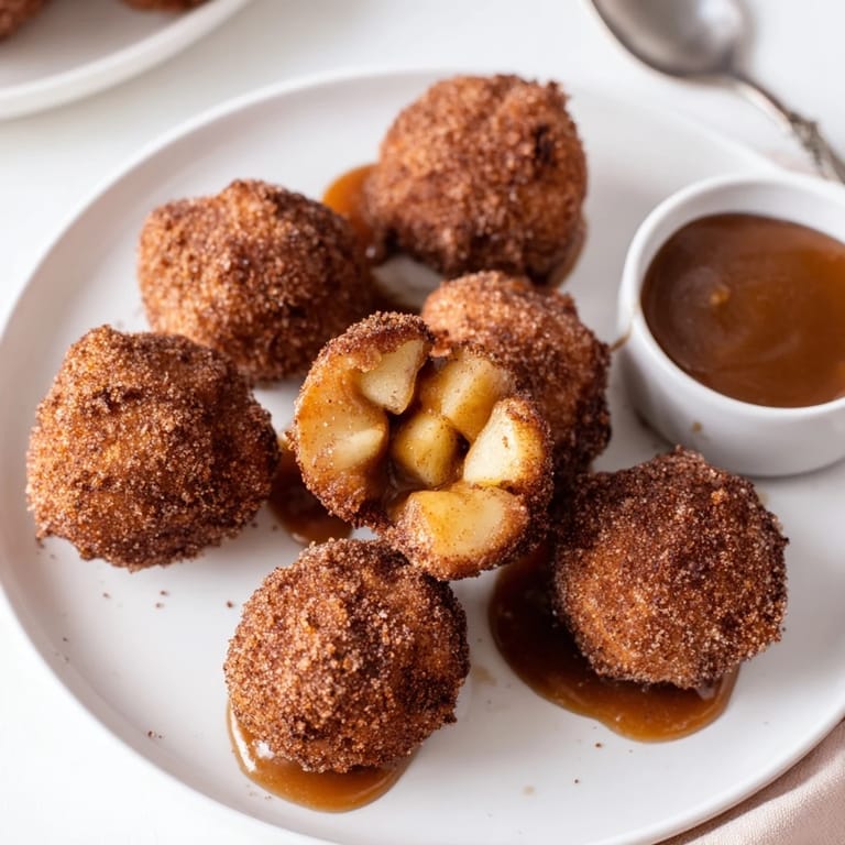 Save A playful twist on classic churros, these bite-sized treats are filled with tender caramelized apples and coated in cinnamon sugar for a delightful dessert or party snack.