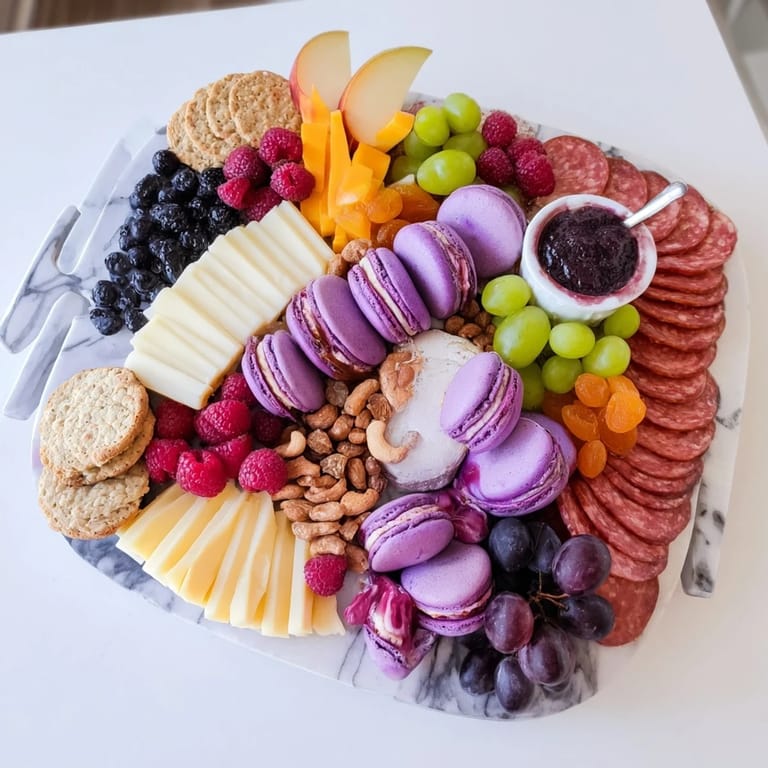 Create a visually stunning board by artfully arranging cured meats, a variety of cheeses, fresh grapes and berries, with accents of dried apricots, nuts, crackers, and sliced baguette. The fusion highlight comes from vibrant Filipino ube macarons, which add color and sweetness alongside traditional flavors. Use different textures and group colors for maximum appeal. Meats can be omitted for a vegetarian board, and wine pairings like crisp rosé enhance the spread. Serve immediately, or refrigerate and let macarons reach room temperature before sharing. Always check labels for potential allergens.