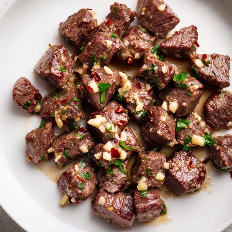 Tender steak cubes pan-seared in a rich garlic butter sauce with fresh parsley and a hint of red pepper.
