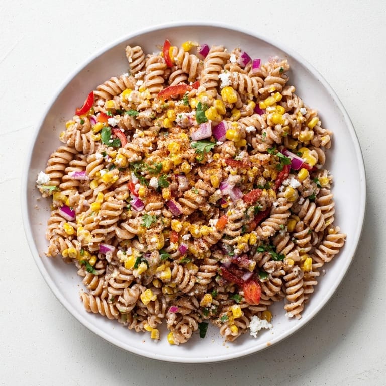 This vibrant dish features charred corn and whole wheat pasta combined with a creamy yogurt dressing infused with lime, smoked paprika, and fresh herbs. Perfectly balanced with mild spices and crumbled cotija or feta cheese, it offers a satisfying light main or flavorful side. The salad is chilled to enhance flavors, with optional jalapeño for heat and substitutions available for dietary preferences. Simple to make and full of texture, it’s a nutritious option inspired by Mexican street food.