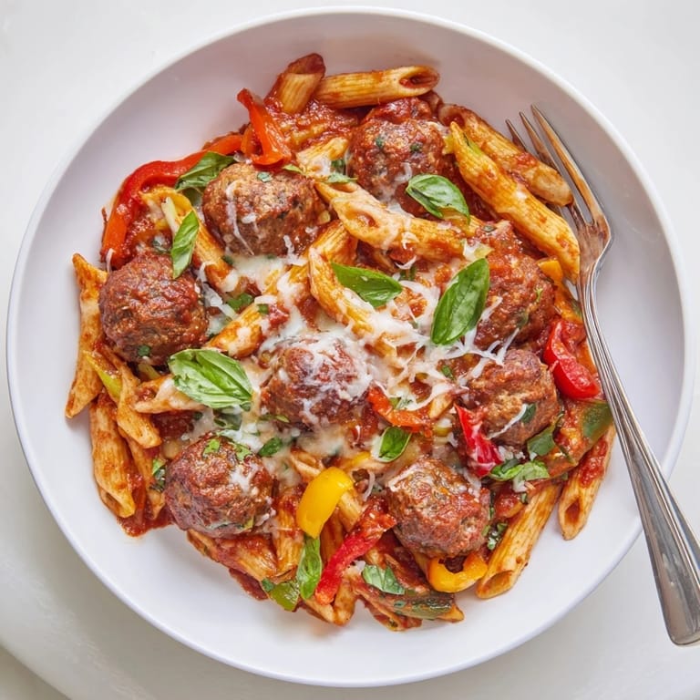 Savor a hearty Italian meal with tender meatballs, pasta, and rich tomato sauce, all cooked in one skillet. Shredded mozzarella and grated Parmesan melt atop the simmered dish, adding a creamy finish. Enjoy bold flavors from garlic, parsley, onion, and bell pepper, balanced by Italian herbs and fresh basil. This easy, comforting main is perfect for family dinners and can be customized with your choice of meat or gluten-free ingredients. Serve hot straight from the skillet for a satisfying, fuss-free meal everyone will love.