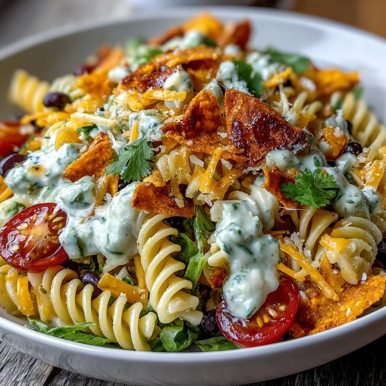 Right before people are about to eat, sprinkle those crushed Doritos on top so they stay crispy and surprise everyone with their presence. This is the timing trick that separates a good taco pasta salad from a soggy mess.