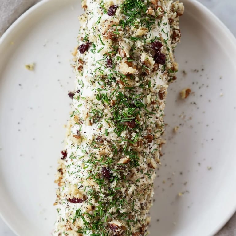 Save A creamy goat cheese log rolled in a snowy blend of herbs, nuts, and dried cranberries perfect for festive gatherings.